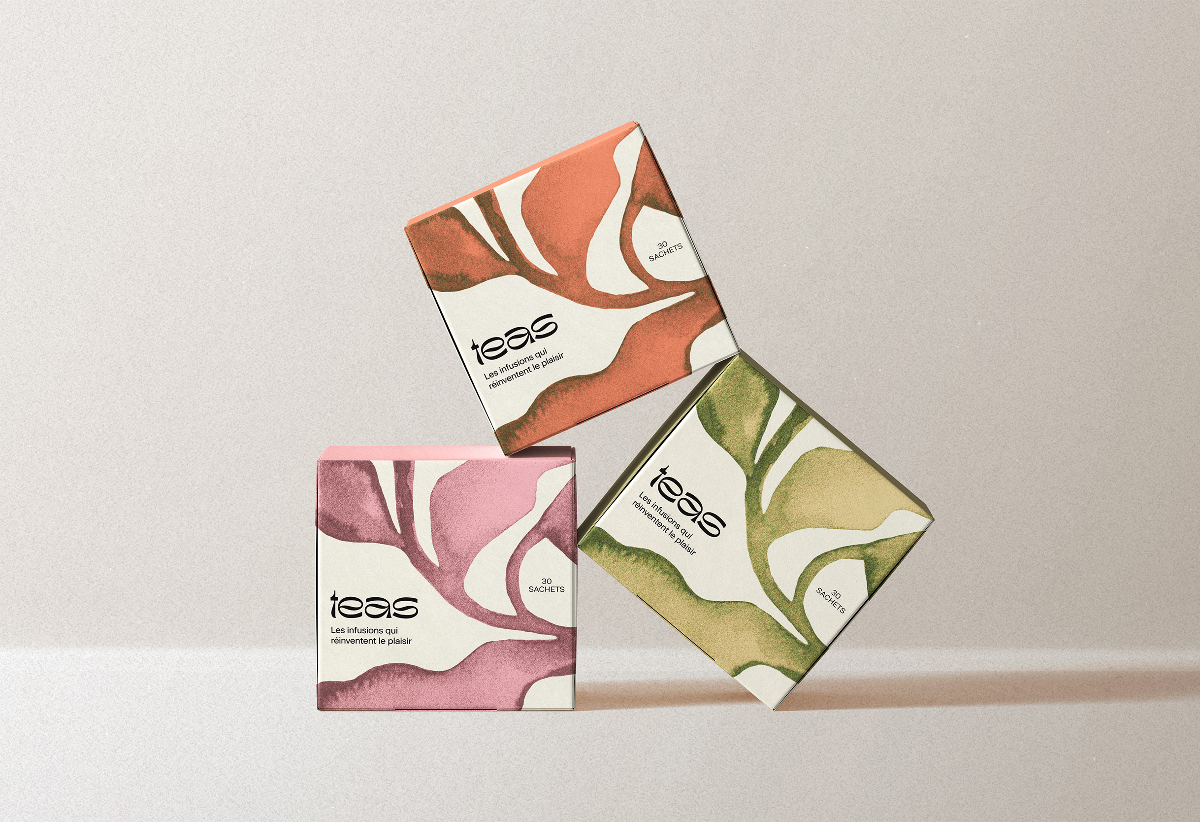 Design des étiquettes de la marque Teas à plat sur fond rose pâle.